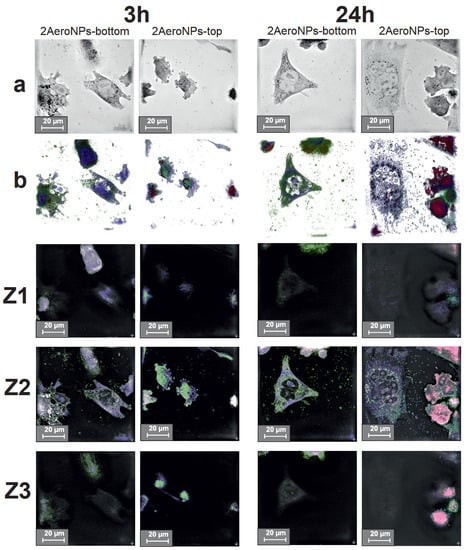 Holotomographic images of U118 cells cultured with the 2AeroNPs-top and 2AeroNPs-bottom dispersions with a concentration of 20 g/mL (a); 3D images reconstructed from RI differences between NPs (red), nucleus and cytoplasm (green), and cell membrane (blue) (b); Z1, Z2, and Z3: holotomographic images of the respective layers. Images were taken after 3 h and 24 h with a scale of 20 m.