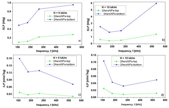 Specific loss power (SLP) (a,b) and intrinsic loss power (ILP) (c,d) as functions of the frequency (f) measured in the external magnetic fields H = 5 kA/m (left column) and H = 15 kA/m (right column) for 2AeroNPs-top (green) and 2AeroNPs-bottom (blue) samples.