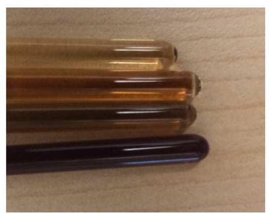 Photograph of phantoms consisting of the NMR tubes containing 1AeroNPs-top dispersions. For the experiment, the concentrations of nanoparticles, 28 mg/mL, 14 mg/mL, 4.67 mg/mL, and 2.8 mg/mL, in the dispersions were used (the darker the color of dispersion in the tube, the higher the concentration of the dispersion).