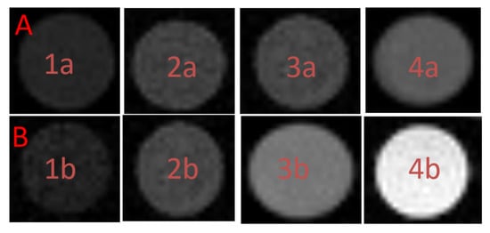 (A) An example of a spin echo T-weighted MR image (TR/TE = 7500 ms/8 ms) of the 1AeroNPs-top (1a, 2a, 3a, 4a) with concentrations of 28 mg/mL (1a), 14 mg/mL (2a), 4.67 mg/mL (3a), and 2.8 mg/mL (4a), respectively (here the darker image of the tube indicates the shorter T, the higher concentration of NPs); (B) An example of a T-weighted MR image (TR/TE = 3 ms/1.5 ms) of the 1AeroNPs-top (1b, 2b, 3b, 4b) with concentrations of 28 mg/mL (1b), 14 mg/mL (2b), 4.67 mg/mL (3b), and 2.8 mg/mL (4b), respectively.