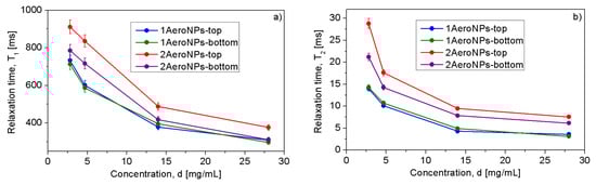 Correlation between T (a) and T (b) relaxation times and concentrations d of FeO NPs in the 1AeroNPs-top and 1AeroNPs-bottom as well as 2AeroNPs-top and 2AeroNPs-bottom samples.