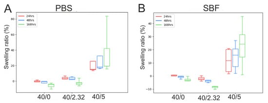 Figure 2B also shows clear trends for each sample group in SBF. Similarly to the swelling results in PBS, the 40/0 and 40/2.32 biomaterials showed a decrease in swelling over time, whereas the 40/5 biomaterials showed an increase in swelling over time. This may be due to both solutions having a pH of 7.4. The 40/0 biomaterials showed the same trend in both SBF and PBS. The 40/2.32 biomaterials incubated in SBF showed a different trend to those incubated in PBS; in SBF, swelling initially decreased and continued to decrease over time, with a much lower swelling ratio at 168 h. The 40/5 biomaterials continued to swell over the recorded time intervals with a large increase in the first 24 h compared to the other groups. Similarly to the swelling ratio results obtained in PBS, the swelling ratio results are precise for the 40/0 and 40/2.32 biomaterials, as shown by the short box plots. However, this is not the case for the 40/5 biomaterials as the box plots are much taller, and therefore, imprecise, although the variance in the swelling ratios for the 40/5 biomaterials in SBF is smaller compared to that in PBS.