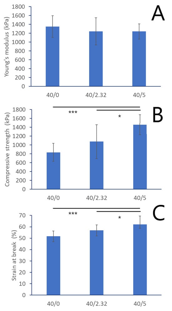 Comparative compression test results for WPI-based biomaterials: 40/0 (control), 40/2.23, and 40/5 (n = 10). (A) Young’s Modulus; (B) ultimate compressive strength; (C) compressive strain at break. Error bars show standard deviation. Significances based on One-Way ANOVA test followed by Tukey’s multiple comparison, p < 0.05 (*: p < 0.05; ***: p < 0.001).
