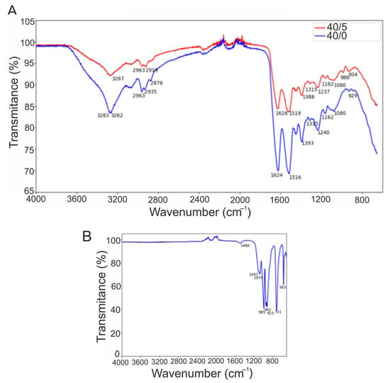 ATR-FTIR spectra for WPI-based biomaterials: 40/0 (control) and 40/5 (A) as well as CaSiO3 powder (B).