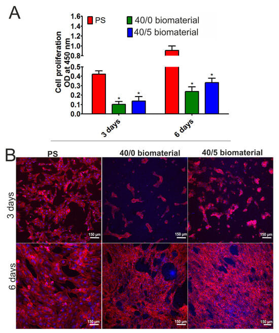 Proliferation of human osteoblasts cultured on the 40/0 and 40/5 biomaterials after 3 and 6 days of incubation. Metabolic activity was assessed via the WST-8 assay (A). * Significantly different results compared to control (cells cultured on polystyrene, PS) according to Two-Way ANOVA test, followed by Bonferroni comparison test, p < 0.05. No statistical differences were observed between the biomaterials. Cell morphology (B) was visualized by staining cell nuclei (Hoechst 33342 dye) and actin filaments of the cytoskeleton (AlexaFluor 635 dye). Cells were observed under a confocal microscope, magnification 100×, scale bar = 150 μm.
