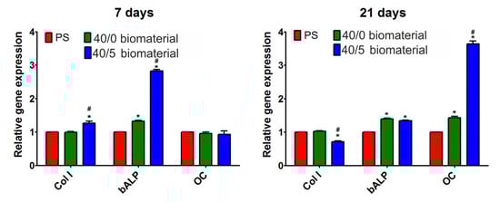 Relative expression level of genes: collagen I (Col I), bone alkaline phosphatase (bALP), and osteocalcin (OC) in human osteoblasts that grew on 40/0 and 40/5 biomaterials. The data were normalized to the expression level of genes in cells maintained on polystyrene (PS). * Significantly different results compared to expression level in cells that grew on PS; # Significantly different results compared to expression level in cells that grew on WPI hydrogel; One-Way ANOVA test followed by Tukey’s multiple comparison, p < 0.05.