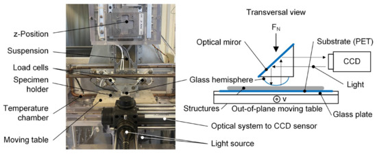 The in situ tribometer (shown in Figure 5) employed in these investigations is an in-house development and has already been described several times in detail by Gauthier et al. [42,43]. For this present optical path, the measurement principle consists of using a glass hemisphere with a diameter of 25.8 mm (Borosilicate BK7 precision lenses, Newport®, Irvine, CA, USA), generating the contact with the structures, and, by means of a mirror placed above the glass hemisphere, the contact formation can be inspected in situ by a CCD sensor at the end of the optical path. The load cell has a force range of 0.01–2.5 N. The possible velocity range is 0.001–1 mm/s.