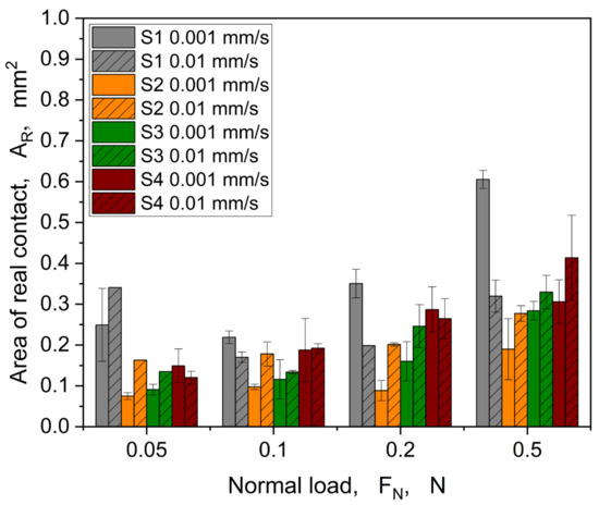 The calculated area of real contact shows generally an increase with increasing load (see Figure 11), which is consistent with the theory of the contact between a rigid body and an elastic solid proposed by the Hertz, for which the contact radius cubed is proportional to the applied normal load [48]. As expected, the different structures show clear deviations from each other in terms of level and progression, which is also depicted in Figure 12 (0.001 mm/s) and Figure 13 (0.01 mm/s), showing in situ images at the maximum tangential force.