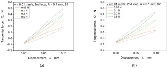 The hysteresis curves show similar changes of the slopes in relation to the normal load dependence, as in the monotonic tests (cp. Figure 8). With an increase in the normal load, the hysteresis loop rises. Furthermore, with the increase in the normal load, it can be seen that the hysteresis curves change their shapes (e.g., roundness), which also seems to be dependent on the different structures.