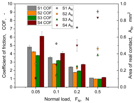 Figure 15 shows the coefficient of friction and the real area of contact, evaluated at the maximum tangential force Qm, against the normal load for the samples S1, S2, S3, and S4.