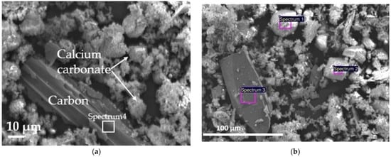 The elemental analysis shows that in WWBA some particles of calcium carbonate (Spectrum 2), carbon (Spectrum 4), sand (Spectrum 3), and compounds from various elements (Spectrum 1) were identified. This made it interesting to research how WWBA of this composition modifies the properties of conventional concrete and cement hydration. More than 10% organic matter in the ash indicates that the incineration process is not optimal and needs to be changed or optimised [47]. The WWBA used was obtained by burning waste wood at 1000–1200 °C for approximately 30 min, but this time, when large quantities of biomass are burnt, it was not sufficient for the complete combustion of raw materials. SEM images shows (Figure 1), that WWBA consists of various shape materials: cubic (usually calcium carbonate), irregular form plates (sand and carbon), sticks, balls, and very fine powders, which covered coarser compounds.