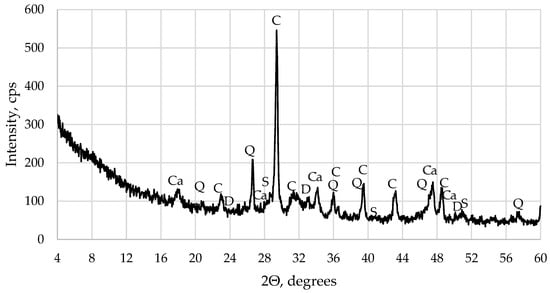 WWBA X-ray diffraction pattern. (Ca—Ca(OH)2 prevails; Q—quartz; C—calcite; S—sylvite; D—dolomite).
