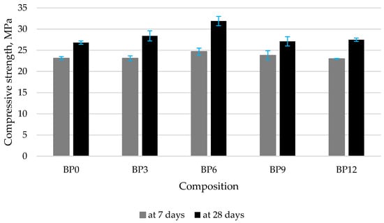 Concrete specimens containing 6% of WWBA had the highest compressive strength (Figure 3). At 7 days, similar compressive strength values were obtained in all batches; however, at 28 days, a 16% increase in compressive strength was observed in the specimens modified with 6% of WWBA. The compressive strength started decreasing with the further increase in WWBA content but remained similar to the strength of control specimens. According to the author [58], the compressive strength increased by 14.8% when 10% of the cement was replaced with wood ash. However, when 20% of the cement was replaced, the compressive strength dropped by 10.1%. Other authors [59] found that the compressive strength difference between control specimens and the specimens containing different amounts of alternative binders tended to decrease with a longer curing time. At 28 days of curing, concretes with 5%, 10%, and 15% cement replacement levels had compressive strengths equal to 93%, 78%, and 68% of the control specimen’s compressive strength, respectively. Similar results were reported by other researchers [60], who obtained the highest strength values of 24.7 MPa in the specimens where 10% of cement was replaced with wood ash. When part of the cement was replaced with WWBA, the compressive strength could increase due to several reasons: (1) high pozzolanic activity of WWBA (high calcite content and potentially active SiO2) [61] or the micro filling capacity of WWBA (average particle size is 24.2 µm).