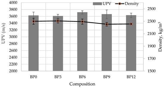 The samples of composition BP6 demonstrated some of the highest density (approx. 2300 kg/m3) and ultrasound pulse velocity UPV (3715 m/s) values (Figure 4). Similar results were reported by authors [62]; the replacement of cement with 5% bottom ash produced the density values 2313 kg/m3. Compared to the control sample, BP6 had the same density and 3% higher UPV values. This means that concrete specimens where 6% of the cement is replaced with WWBA retain the same dense structure. With the addition of 9% WWBA, the density and UPV values started to reduce, and more pores and capillaries were formed. Such changes in concrete structure can be explained by the increased water demand by WWBA, the lower density of WWBA compared to cement density, and the possible change in the rate and progress of cement hydration. Similar results were obtained by the authors [63]. They established that the highest density, ultrasound pulse velocity, and compressive strength of concrete are the highest, when 5% of cement were replaced by biomass combustion fly ash (BM-FA). The explanation of such results was that in this composition, concrete contained much less free water, which affects the development of open pores. In the work [64] it was determined that replacement of up to 10% of cement with BM-FA the paste exhibits better rheological properties, not only lower yield stress but also lower viscosity and helped retain plasticizing effect. Then, the concrete has a higher density and a lower open porosity. Additionally, it has often been reported [35], that the presence of dominant fine particles in cementitious materials will lead to more water demand due to their larger surface area.