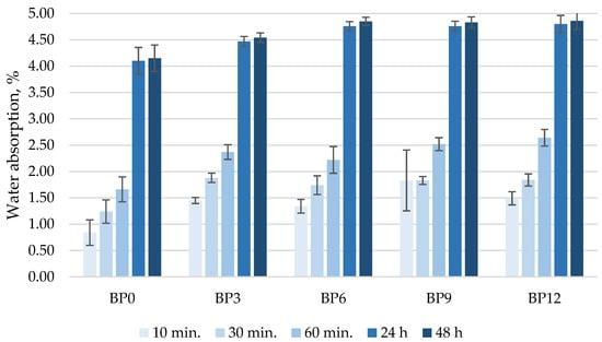 Figure 5 illustrates the water absorption results of concrete samples cured in water for 28 days. It should be noted that the water absorption rate reached 1.8% during the first 10 min, 1.9% after 30 min, 2.6% after 60 min, and after 24 h, the specimens absorbed approximately 4.8% of water by the weight of the specimen. Water absorption followed the same trend, and after 48 h it was 4.9%. The water absorption kinetics test revealed that the samples without WWBA had lower water absorption values compared to other samples and that this could be due to the porosity of the WWBA particles, the high surface area, and the ability to absorb water.