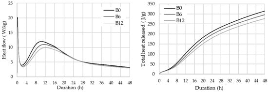 The calorimetry tests (Figure 6, Table 8 and Table 9) showed that WWBA retarded cement hydration: the peak of the third stage of hydration was reached 75 min (B6) and 108 min (B12) slower, while after 48 h the heat of hydration and the degree of hydration in the samples modified with WWBA reduced 6% and 12%, respectively, depending on the reduced cement content in the mix. These results show that during the first 48 h WWBA has no effect on cement hydration and acts as an inert additive; the amount of released heat drops by the same percentage as the percent of replaced cement.