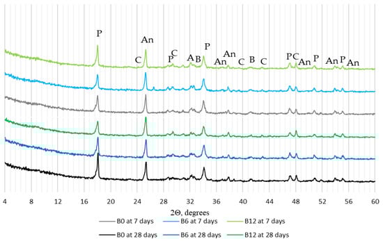 To understand the influence of WWBA on cement hydration, samples (40 × 40 × 40 mm) of three additional mixtures B0, B6, and B12 were prepared without aggregates. The mineral composition and microstructure of the products present in the hardened pastes were studied by X-ray diffraction (XRD) and thermogravimetric analysis (TGA) after 7 and 28 days of curing in water. Hydration was stopped by immersing crushed samples in acetone for 72 h and then drying them in an electric oven at 50 °C for 24 h. Anatase was used as the internal standard for XRD analysis of concrete specimens with the binder: anatase ratio of 9:1. The height of the peaks of all diffraction patterns was adjusted in order to have the same intensity of the main anatase peak (2θ = 25.28°) in all diffraction patterns so that the relative intensity of the other peaks would be comparable. Thermal analysis (TGA) was performed with a PerkinElmer TGA 4000 thermal analyser (Rodgau, Germany). Samples with a weight of 50–60 mg were placed in a platinum crucible and heated at 10 °C/min in a nitrogen environment up to 1000 °C. The amount of portlandite was calculated according to the author [57] the mass loss within the 430–560 °C temperature range.