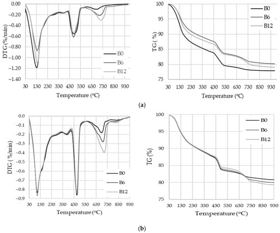 According to X-ray analysis (Figure 7), the amount of portlandite decreased in WWBA modified specimens modified with WWBA (peak intensity decreased at approximately 18° and 34°), and this trend was expressed more after 28 days of curing. The test results also revealed a lower intensity of the main peak of alite (approx. at 32°). These results suggest that WWBA has binding properties and acts as a pozzolanic additive; on the other hand, the intensities of these minerals could have been reduced due to the lower cement content in the mixture. Therefore, the thermal analysis of selected specimens B0, B6, and B12 was carried out to determine the amount of portlandite.