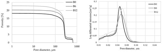 The Mercury Intrusion Porosimetry (MIP) test showed that WWBA increases the porosity of hardened cement paste (Figure 9): with the addition of WWBA at 6%, the porosity of hardened cement paste increased 11.5% and with 12% of WWBA the porosity increases 25.8%. WWBA also caused the average diameter of the pores to increase from 0.046 µm (B0) to 0.059 µm (B6) and to 0.049 µm (B12). Although the diameter of most of the pores in samples B6 increased, these pores were lower in quantity compared to the control specimen, while the number of pores with diameter below 0.04 µm was significantly lower. This result explains why samples B6 had the highest density and UPV values, especially compared to B0 and B12. In the literature [65], it is written that the use of WWBA as a filler in cement-based materials is possible when the size limits are such as 250 µm. Performance in cement paste is influenced by two known mechanisms, namely particle packing and filler effect phenomena. Additionally, the added WWBA particles would act as a nucleation zone after their integration into the cement paste, resulting in improved hydration and subsequently the enhancement of compressive strength [35]. The increase in the general porosity of WWBA-produced cementitious materials could be caused by irregular shaped particles of ash that contain numerous pores not filled by the hydration products after curing and subsequent hardening, but micropores in the size range of 0.01–0.1 µm could greatly increase due to the wide distribution of particles and irregular particle structures which seem to fill the pores [66].