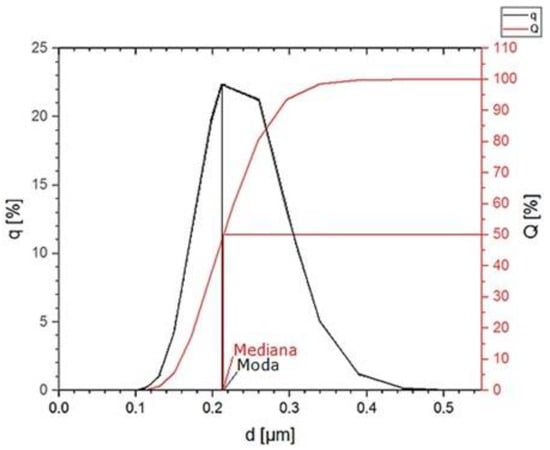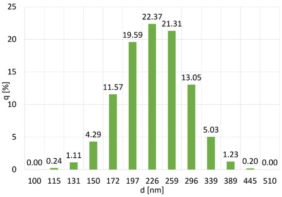 The PSD distribution of the Al2O3 powder is symmetrical (Figure 1), proving the powder’s high homogeneity. This is also evidenced by the value of the mean being close to the value of the mode and the median (Figure 2). The analysis showed that the average particle size is 218 ± 49 nm. The most numerous fractions are particles with a diameter of 226 nm and 259 nm, the largest in the population. The probability of occurrence of particles with a diameter below 158 nm is 10%. The measured particle sizes are approximately twice the manufacturer’s specifications. This may be due to the formation of powder agglomerates. The tendency of the powder to form agglomerates will be determined later in the work based on SEM observations.