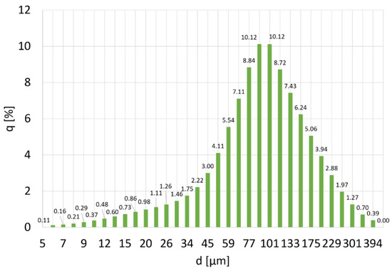The analysis of the size distribution of copper particles showed that the most numerous fractions are particles with a size of 101 and 89 µm. Their share in the powder volume is 10% for each fraction (Figure 3). The average particle size is 100 ± 61 µm. The mode value is 83 µm, and the median is 87 µm (Figure 4). The particle size distribution is vast, but the powder can be considered homogenous due to the small fraction of the smallest particles. The D10 value for Cu powder is 33 µm and D90 = 182 µm.