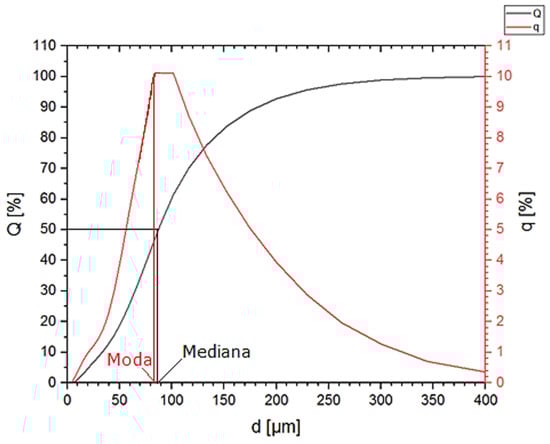 Particle size distribution q (%) and cumulative particle size distribution Q (%) of the Al2O3 powder.