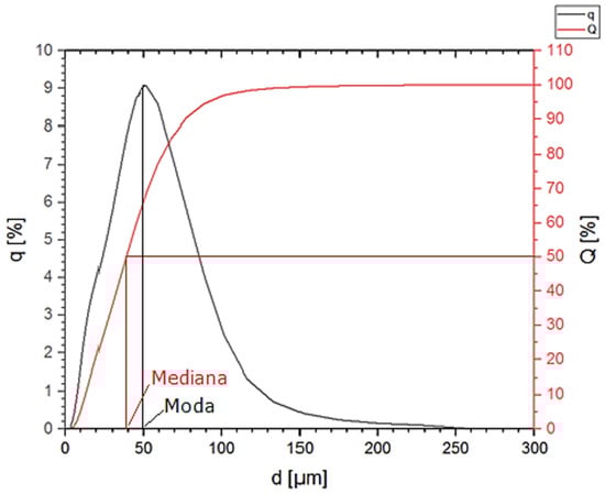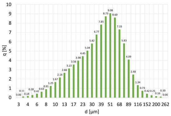 According to the PSD distribution for chromium powder obtained in the DLS analysis, the most numerous fractions in the population are particles with a size of 45 µm, 51 µm, and 59 µm. Their content in the population is approx. 9% (Figure 5). The particle size distribution is wide. The determined values of the mode and the median (Figure 6) are close to the mean diameter of the particles. However, it is the least homogenous of the composites used to produce it. The average particle size of the population is 43 ± 27 µm. The probability of occurrence of particles below 13 µm in diameter is 10%, and particles with a diameter of less than 77 µm are 90%.