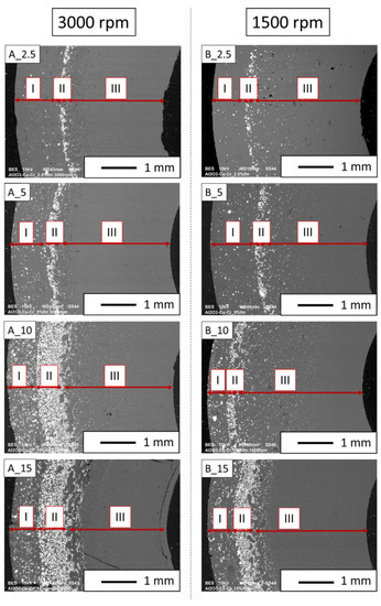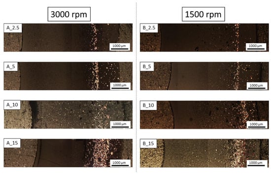 In the central zones of the composite microstructure, where the accumulation of the metallic phase was the highest, it was observed that more red metallic phases appeared from the side of the outer edges and more of the light-yellow phase closer to the inner edge. In these zones, the distribution of the metallic phase was affected by the centrifugal force, which depends on the mass of the particle it affects and the centrifugal acceleration. Since copper is denser than chromium, the red metallic phase is likely copper, and the light-yellow metallic phase is chromium. Figure 8 shows the microstructure of composites in cross-section. This phenomenon is best visible for the B_15 composite.