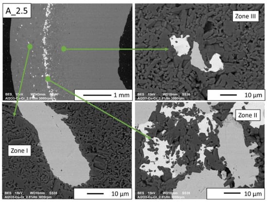 The SEM images of the A_2.5 and A_5 composites (Figure 10 and Figure 11, respectively) revealed that all distinguished gradient zones achieved a good connection between the reinforcement and the matrix. There are no delaminations and porosities at the phase separation boundary. It can be observed that the copper in the sintering process penetrated between the ceramic particles. This is particularly noticeable in Zone II, where the highest accumulation of the metallic phase occurred.