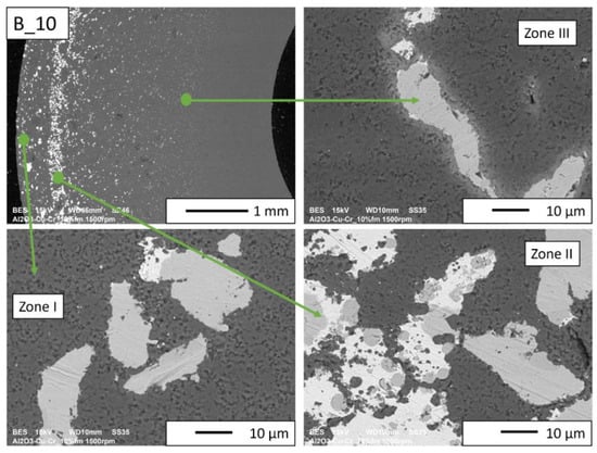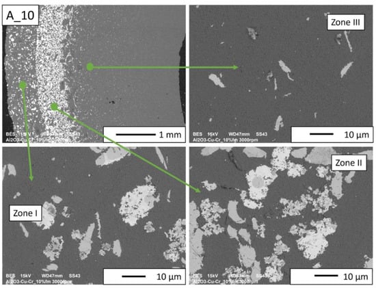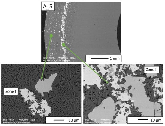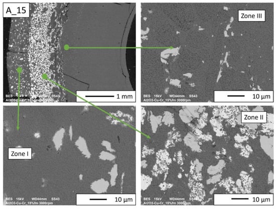 In the case of A_10 and A_15 composites (Figure 12 and Figure 13, respectively), there are no porosities and delaminations at the phase separation boundaries. In Zone II, spherical chromium particles are visible inside the copper regions. Ceramic particles are visible in the copper areas. This proves that a suitable penetration of liquid copper between the particles was obtained. Based on the images of the microstructure of these composites, it can be seen that the increase in the chromium content improved the wettability of the matrix by liquid copper. The presence of Cr particles, well wetted by Cu, makes the liquid phase better distributed inside the sample. The structure closest to the percolation one was obtained for Zone II of the A_15 composite.