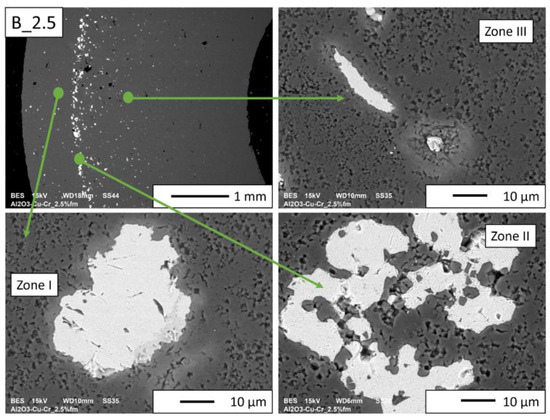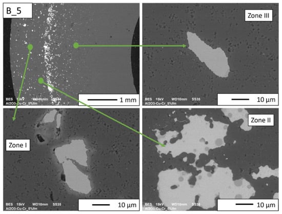 In the case of B_2.5 composites and in Zones I and III of the B_5 composite (Figure 14 and Figure 15), pores can be observed at the boundaries of the separation of the metallic phase and Al2O3.