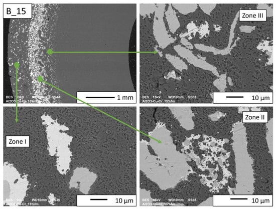 No porosity was observed at the interface between the metallic phase and the matrix for the B_10 and B_15 composites (Figure 16 and Figure 17, respectively). In addition, it was observed that in Zone II of these samples, copper is located between small ceramic particles, which indicates an improvement in the wettability of the matrix by copper with the increase in the proportion of the metallic phase. At the sintering temperature (1400 °C), approximately 8% Cr is dissolved in copper by weight. A solution can only form where the copper and chromium particles are in contact. The probability of contact between the particles of both metals increases with the increase in the proportion of the metallic phase. In the gradient sample, it is the largest in Zone II. Most likely, the chromium content not exceeding 5%vol is insufficient for the reaction between the copper and chromium particles to occur.