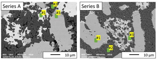 Based on the selected results of the chemical composition analysis, it was found that Cu, Cr, Al, and O2 were present in the microstructure of the A and B series composites (Table 6). The tests confirmed earlier assumptions that the areas can be classified as follows: the lighter metallic phase is copper, the darker is chromium, and the darkest areas are aluminum oxide (Figure 18).
