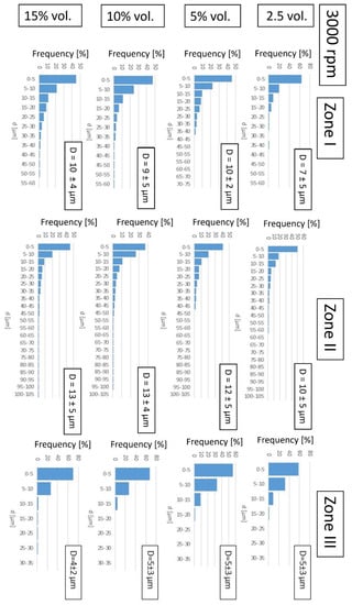 Histograms of the size of the metallic phase agglomerates of the composites produced for each zone along with their average size—D for a series of samples produced at 3000 rpm.