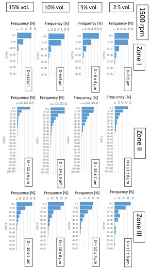 Histograms of the size of the metallic phase agglomerates of the composites produced for each zone along with their average size—D for a series of samples produced at 1500 rpm.