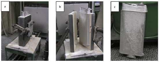 Casting of ingots of alloys used in the present study showing: (a) metallic mold with casting; (b) open mold showing casting inside; (c) actual casting.