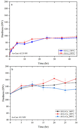 - The hardness of the Al-Li-Cu and Al-Li-Cu-Sc alloys increases rapidly with aging time and reaches a maximum, and then decreases slowly. The hardness of these two alloys exhibits an initial increase followed by a slight decrease during the aging process.