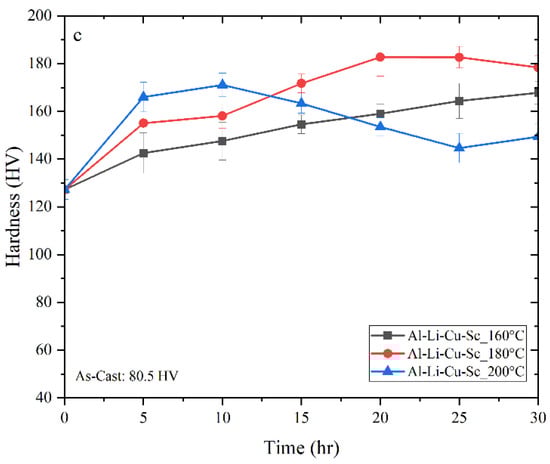 Under these conditions, the maximum hardness of the heat-treated Al-Li, Al-Li-Cu and Al-Li-Cu-Sc alloys are, respectively, 97.2 HV, 163.6 HV, and 182.6 HV.