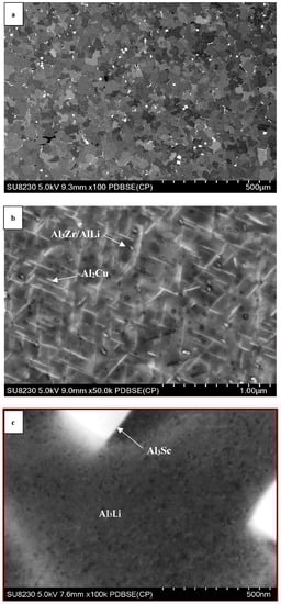 In addition to the named precipitates, the Al-Li-Cu-Sc alloy containing Sc exhibited the highest hardness values. This was ascribed to the presence of Al3Sc precipitates, which, having a very small size (10–100 nanometers), creates a high density of obstacles for dislocations to move through. Furthermore, the addition of Sc to aluminum alloys promotes the formation of a high density of fine, uniformly distributed precipitates within the grains which further contribute to the strengthening [14,20].