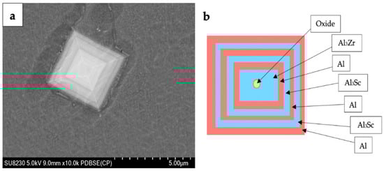 According to the studies conducted by Norman et al. [25] and Hyde et al. [26], it has been suggested that primary Al3(Sc,Zr) particles possess a quasi-cubic morphology, while their two-dimensional shape appears to be rectangular. The SEM micrograph in Figure 6a reveals a triangular-shaped Al3(Sc,Zr) particle. The distribution of alloying elements is heterogeneous. The particle exhibits a layered structure, where each layer has a distinct composition. Some layers are enriched in Sc or Zr but depleted in Al, while other layers are enriched in Al but depleted in Sc and Zr. A diagrammatic representation of the layered structure of the rectangular particle is provided in Figure 6b.