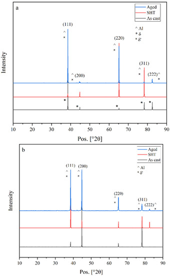 As may be seen from Figure 7b, while different secondary phases were observed in the as-cast alloy, α-Al and Al3Li phases were the main peaks noted. In the context of previous studies [30], other phases such as Al2Cu, AlLi, and Al6CuLi3 should also exist in the as-cast alloy, but no visible peaks of these phases were discerned in the present sample, possibly because of their relatively small amounts. According to Noble and Bray [31], the intermetallic phase δ’-Al3Li is present in all the as-cast alloys due to the decomposition of the α-Al supersaturated solid solution during the solidification process.