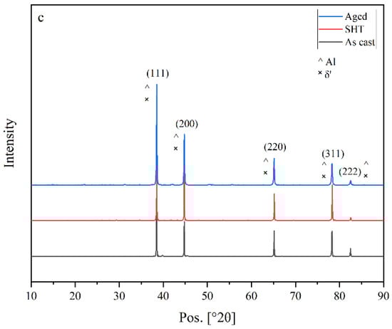 In the Al-Li alloys, based on the XRD phase analysis and detection results, it was observed (Figure 7a) that the predominant Li-containing alloy phases present in the Al-Li alloy were α-Al, AlLi, and Al3Li phases. Furthermore, it was found that these phases remained unchanged even after subjecting the alloy to heat treatment. In the as-cast alloy, α-Al and AlLi phases were the main peaks. Most intermetallic phases that dissolved into the Al matrix cause the decline of the diffraction peaks of the secondary phases after solution heat treatment. The δ (AlLi) phase disappeared after aging (SHT + 150 °C /45 h) and the δ’ (Al3Li) phase was precipitated and appeared.