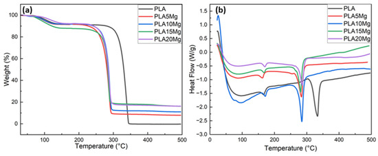 (a) TGA and (b) DSC results for PLA/Mg composites with varying amounts of Mg, showing the thermal stability and heat flow of PLA as the Mg content increases.