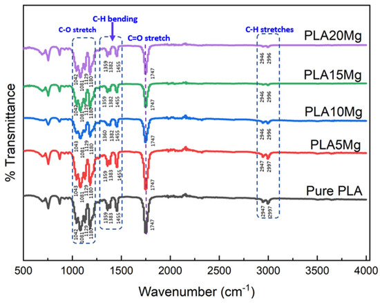 To analyze a PLA/Mg composite using Fourier transform infrared (FTIR) spectroscopy, the PLA/Mg film is placed in the sample chamber of an FTIR spectrometer, and the absorption of IR radiation by the sample is measured over a range of wavelengths. FTIR spectroscopy is a technique used to identify and characterize the chemical functional groups present in a material by measuring the absorption of infrared radiation. As shown in Figure 4, the FTIR spectrum of a PLA/Mg composite shows the absorption bands of the functional groups present in the PLA matrix and the Mg-reinforcing particles. The intensity and position of the absorption bands can be used to quantify the amount of each component in the composite and to determine the degree of interaction between the two materials. The FTIR spectrum can also identify other elements present in the composite, such as additives or impurities. Only minor differences between the PLA and PLA/Mg composites suggest that the chemical linkages were comparable and compatible with the literature [30]. Even though there is a slight shift in the C-H stretch, overall, there is no significant difference in the peak positions, while the peak intensities reduced a bit after incorporating Mg particles. The intensity of the peaks at 2947 cm−1, associated with CH2 stretching, reduced as the proportion of Mg in the composite increased, which supports the idea that there is an interaction between the ester group (R-COOR’) in PLA and Mg particles. Furthermore, the peak at 1747 cm−1, which is a characteristic peak of PLA and is associated with the carboxyl bond of the ester group, becomes less intense as the amount of Mg in the composite increases, which indicates that the composites are undergoing degradation or an interaction with another component.