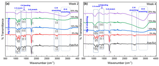 FTIR results showing the degradation of PLA and PLA/Mg composites in PBS solution dissolved for (a) 2 weeks and (b) 4 weeks.
