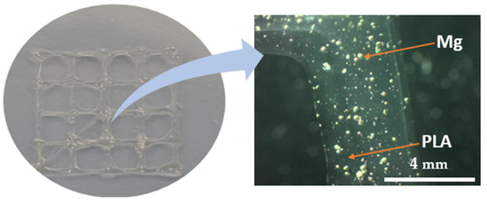 The ink’s rheological properties refer to its flow behavior and mechanical properties, such as its viscosity, elasticity, and shear-thinning behavior, and printing parameters are the most critical parameters for a successful printing process. These properties can impact the extrusion of the bioink from the printing nozzle, as well as the stability and shape retention of the printed structure. The bioink must have the appropriate rheological properties to allow for the precise deposition and layer-by-layer building of the structure. After several experimental trials, a viscosity of 106 was found to be optimum for a successful bioprinting process. Besides rheological properties, an optimal set of 3DP process parameters is vital to achieve the desired shape stability. Therefore, extensive experimentation to achieve a successful 3D print was performed, and with a printing speed of 2 mm/s and a layer height of 0.1 mm, the designed geometry was successfully fabricated. It is worth noting that the optimal set of process parameters varies based on the material compositions and may require optimization for different Mg content in the PLA matrix. Therefore, using the optimal process parameters, the designed mesh was successfully fabricated using PLA/Mg composites with 5 wt% of Mg content. The 3D-printed structure was manufactured with appropriate dimensional accuracy, as reported in Figure 8. The uniform distribution of Mg particles within the PLA matrix is also crucial to achieving the desired performance of 3D-printed composites. Therefore, the 3D-printed mesh was examined under a microscope, and homogenously dispersed Mg particles within the extrudate were observed, as confirmed by the microscopic images. This study presents a preliminary analysis of the potential of using PLA/Mg composite ink using DIW 3D printing to fabricate 3D structures. However, future studies will report complex scaffold shapes, the optimization of other PLA/Mg composite compositions, and the optimization of the bioprinting process.