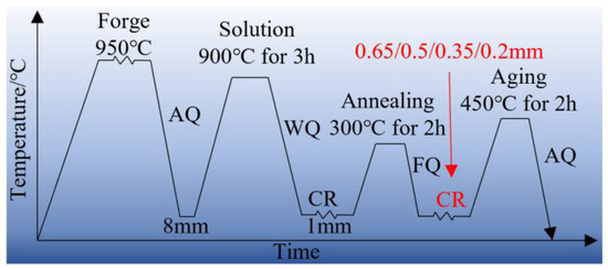 The cathode pure copper (99.99 wt%) and Ni-Cr intermediate alloys were melted in an intermediate frequency induction furnace, and charcoal was used as a cover agent for atmospheric melting, and they were then cast into a graphite crucible to obtain a cylindrical ingot. The ingot was homogenized at 950 °C for 12 h to eliminate the segregation of alloying elements. The actual composition of the alloy was determined to be Cu-1.16 wt% Ni-0.36 wt% Cr. Through previous work, the best hot working process of the alloy was 950 °C, 1 s−1, and the alloy was forged into a plate of 200 mm × 160 mm × 8 mm. Before cold rolling, the forged alloy was treated with a solid solution at 900 °C, with a solution time of 3 h, and the cooling medium was water. And then the alloy was cold rolled to 1 mm, and the rolling strain was 87.5%. The first cold-rolled alloy underwent an annealing process at 300 °C for 2 h. This annealing treatment was performed to partially eliminate the work hardening that occurred during cold rolling. The alloy was then cooled in a furnace to obtain the annealed alloy with reduced work hardening. The cold-rolling deformation of the second cold rolling was 35%, 50%, 65%, and 80%, and the thickness of the copper alloy sheet was 0.65 mm, 0.5 mm, 0.35 mm, and 0.2 mm, respectively. Subsequently, the copper alloy sheets with different thicknesses were aged at 450 °C for 2 h to obtain the aged alloy. The schematic illustration of the deformation and heat treatment process are shown in Figure 1. The rolling strain is described by the rolled strain ratio . , h: the uniform thickness of the plate cross-section after rolling; : the initial uniform thickness of the plate cross-section. Copper alloy plates with specific thicknesses of 0.65 mm, 0.5 mm, 0.35 mm, and 0.2 mm were classified into a distinct rolling strain, namely 2.9, 3.2, 3.6, and 4.3, respectively.