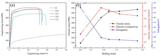 Curves of the Cu-Ni-Cr alloy at different rolling strains. (a) Strain–stress curve; (b) Change curve of tensile strength, elongation, and electrical conductivity.