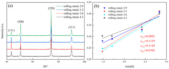 The XRD images of the alloys at different rolling strains are shown in Figure 6a. With an increase of the rolling strain, the strength of the <111> peak increases, which is similar to the result of EBSD. The XRD patterns show that there is no obvious peak shift in the cold rolling process. However, with the increase of the cold rolling strain, the half-peak width changes, which shows a change of the micro-strain in the alloy after the thermo-mechanical treatment. According to the Williamson–Hall equation [16], the micro-strain in the alloy can be reflected by X-ray diffraction data.