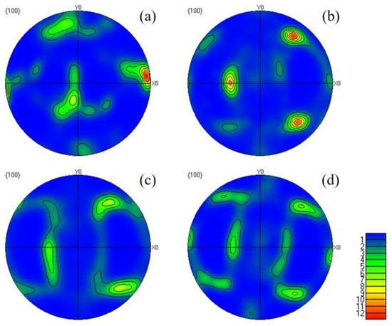 Figure 7 presents the pole diagram of the alloy in the 001 direction under various rolling strains. This diagram indicates that at strain levels of 2.9, 3.2, 3.6, and 4.3, the maximum strength of the internal texture of the alloy is measured as 12.58, 11.28, 9.84, and 8.64, respectively. Based on Figure 7a, it is evident that when the rolling strain is 2.9, the texture is concentrated in the X0 direction, indicating that the grains are elongated along the rolling direction. The texture is mainly an S texture, which corresponds to a large number of grains parallel to the <100> direction in Figure 4b. With an increasing strain, the maximum strength of the texture gradually decreases, and the texture aligned with the rolling direction transitions towards the <110> and <111> directions. With further increases in the rolling strain, the textures in the <110> and <111> directions stabilize. It can be inferred that the change in texture, with the increasing rolling strain, represents a transformation from the S texture to the Brass texture {011} <211> and the copper texture {112} <111>.